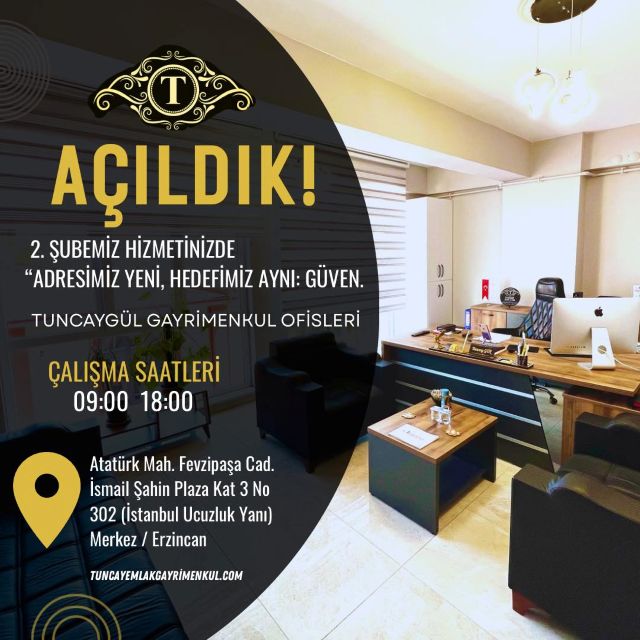 Çağdaş İş İnsanları Derneği (ÇAĞSİAD) Erzincan Temsilcisi ve Tuncaygül Gayrimenkul Emlak sahibi Tuncay Gül, 2. şubesini Erzincan’da hizmete açtı. Yeni şube, Fevzipaşa Caddesi, İsmail Şahin Plaza Kat 3 No:302 (İstanbul Ucuzluk yanı) Merkez / Erzincan adresinde hizmet verecek.