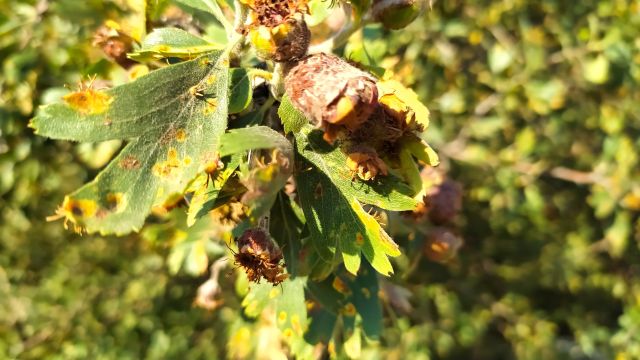 Dikenlerle kaplanmış hastalıklı alıç meyvesi.