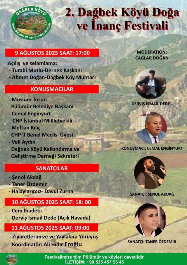 Dağbek Köyü Kalkındırma ve Geliştirme Derneği tarafından düzenlenen 2’nci Doğa ve İnanç Festivali, 9 Ağustos 2025’te renkli etkinliklerle başladı. Üç gün sürecek olan festival, köy halkı ve çevre köylerden gelen misafirlerin yoğun ilgisiyle karşılandı. CHP Milletvekili Cemal Enginyurt, katılımcılara seslendi.