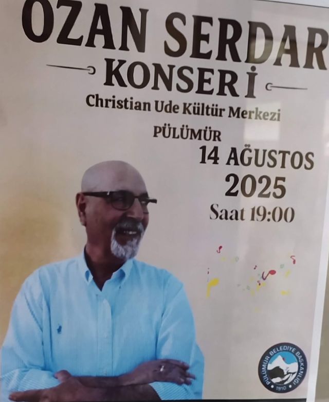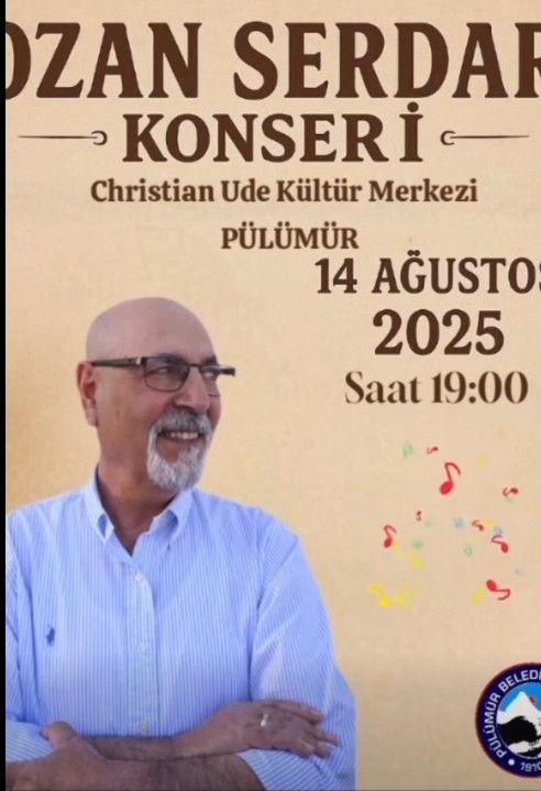 Ozan Serdar, Pülümür’e geliyor. Serdar, Pülümür Belediyesinin davetlisi olarak ilçede halka açık ücretsiz dinleti sunacak. 14 Ağustos Çarşamba günü saat 19.00’da Pülümür Christian Ude Kültür Merkezinde sunulacak dinletiye Pülümürlülerin ilgi göstermesi bekleniyor.