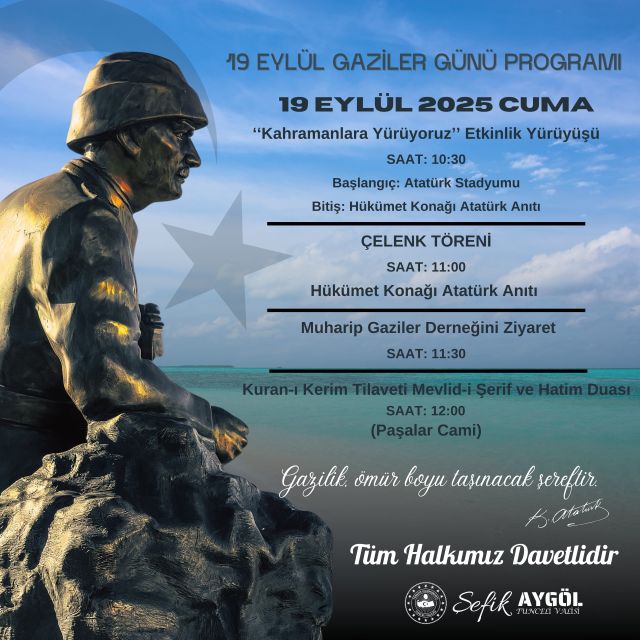 Tunceli Valiliği, 19 Eylül Gaziler Günü dolayısıyla anlamlı bir program düzenliyor. Vatan uğruna canlarını ortaya koyan kahraman gazilerimizi anmak ve onlara minnet duygularını iletmek amacıyla hazırlanan etkinlikler, 19 Eylül Cuma günü gerçekleştirilecek.