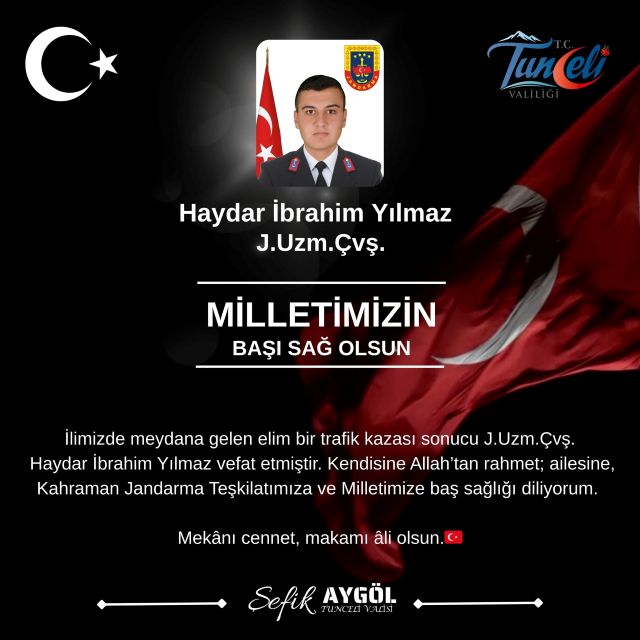 Jandarma Uzman Çavuş Haydar İbrahim Yılmaz, Tunceli’de geçirdiği trafik kazası sonucu şehit oldu. Acı olay, hem görev arkadaşlarını hem de memleketi Kahramanmaraş’ı yasa boğdu. Şehit Jandarma Uzman Çavuş Haydar İbrahim Yılmaz için Tunceli İl Jandarma Komutanlığı Bayraktepe Kışlası’nda tören düzenlendi. Törene Tunceli Valisi Şefik Aygöl, askeri yetkililer, silah arkadaşları ve vatandaşlar katıldı.