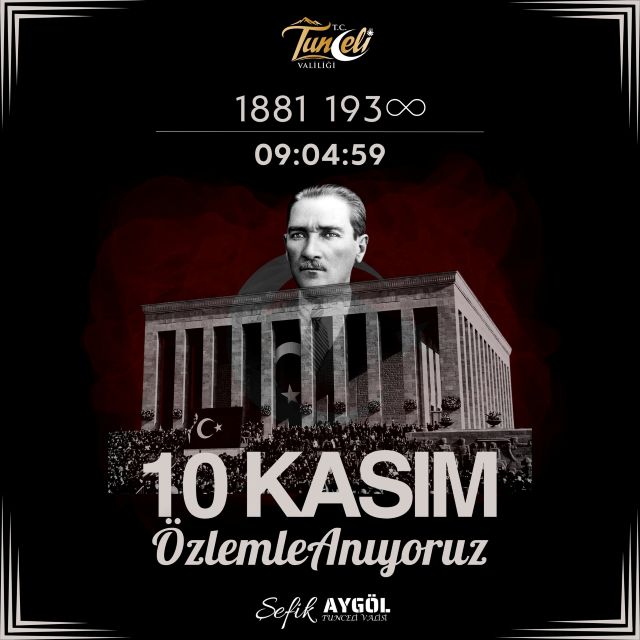 Türkiye Cumhuriyeti’nin kurucusu Ulu Önder Gazi Mustafa Kemal Atatürk, ebediyete intikalinin yıl dönümünde Tunceli’de düzenlenen törenlerle anıldı. Tunceli Valisi Şefik Aygöl, 10 Kasım Atatürk’ü Anma Günü dolayısıyla yayımladığı mesajda, “Cumhuriyetimizin kurucusu, Ulu Önder Gazi Mustafa Kemal Atatürk’ü, ebediyete intikalinin yıldönümünde sonsuz bir özlem, derin bir minnet ve saygıyla anıyoruz,” ifadelerine yer verdi.