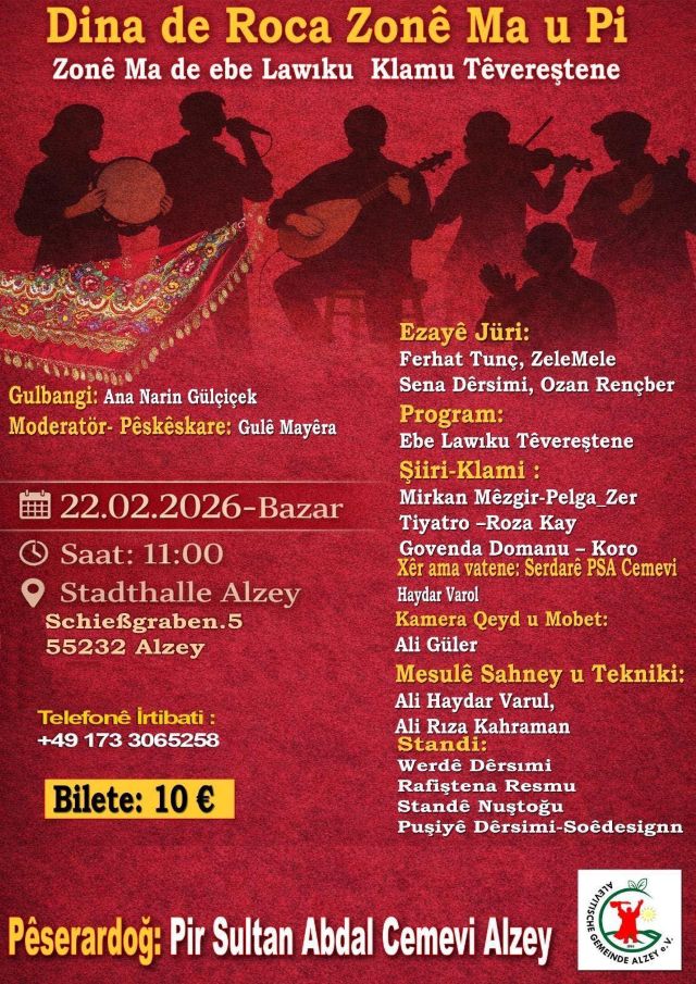 Etkinlik, 22 Şubat 2026 Pazar günü saat 11.00’de Alzey Stadthalle’de gerçekleştirilecek. Programda şiir, klam, tiyatro ve halk dansları gibi kültürel gösteriler yer alacak. Jüri üyeleri arasında sanatçı Ferhat Tunç, ZeleMele, Sena Dêrsimi ve Ozan Rençber bulunuyor.
