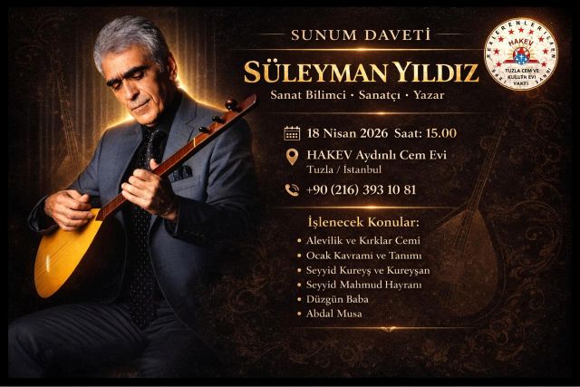 Türk Halk Müziği Sanatçısı ve Yazar Süleyman Yıldız, 18 Nisan Cumartesi günü saat 15.00’te HAKEV Vakfı Tuzla Cem ve Kültür Evinde düzenlenecek özel bir sunumla sevenleriyle buluşacak. Etkinlikte Alevilik ve Kırklar Cemi, Ocak kavramı, Seyyid Kureyş ve Kureyşan, Seyyid Mahmud Hayrani, Düzgün Baba ve Abdal Musa gibi önemli konular ele alınacak.