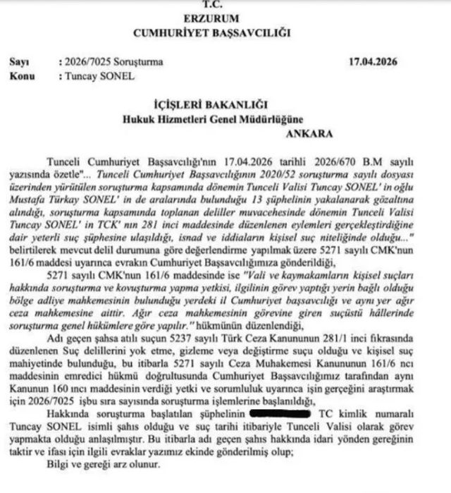 Tunceli Cumhuriyet Başsavcılığı, Gülistan Doku soruşturması kapsamında dönemin Tunceli Valisi Tuncay Sonel hakkında işlem yapılması için Erzurum Cumhuriyet Başsavcılığı’na yazı gönderdi. Yazıda, Sonel’in “delil gizleme ve yok etme” suçlarına ilişkin yeterli şüpheye ulaşıldığı belirtildi. Ayrıca, valilerin kişisel suçlarıyla ilgili soruşturma yetkisinin, görev yaptıkları ilin bağlı olduğu bölge adliye mahkemesi Cumhuriyet Başsavcılığına ait olduğu vurgulandı.