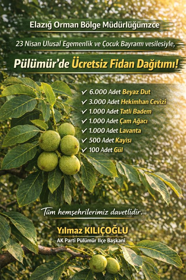 23 Nisan Ulusal Egemenlik ve Çocuk Bayramı dolayısıyla Elazığ Orman Bölge Müdürlüğü, Pülümür İlçe Orman İşletme Müdürlüğü bahçesinde ücretsiz fidan dağıtımı gerçekleştirecek. Etkinlik, 23 Nisan Perşembe günü saat 13.00’te düzenlenecek.