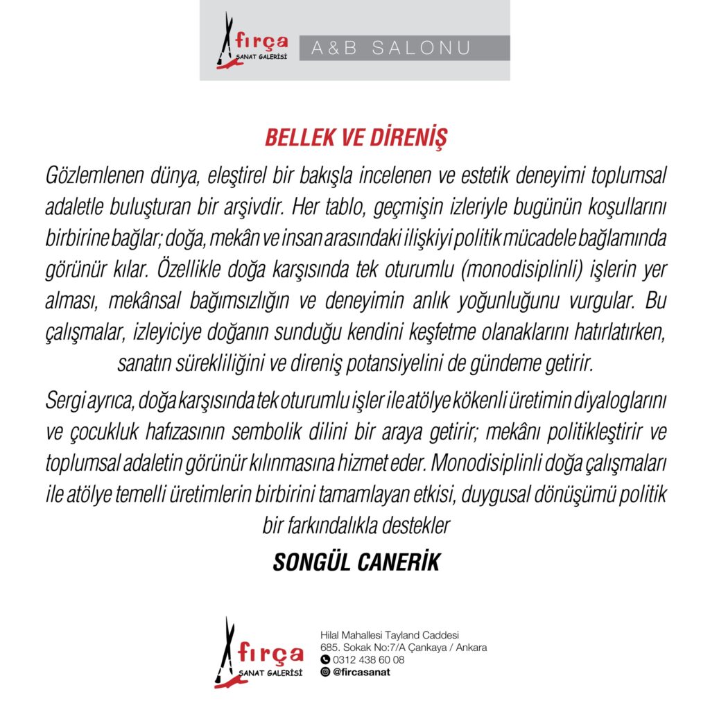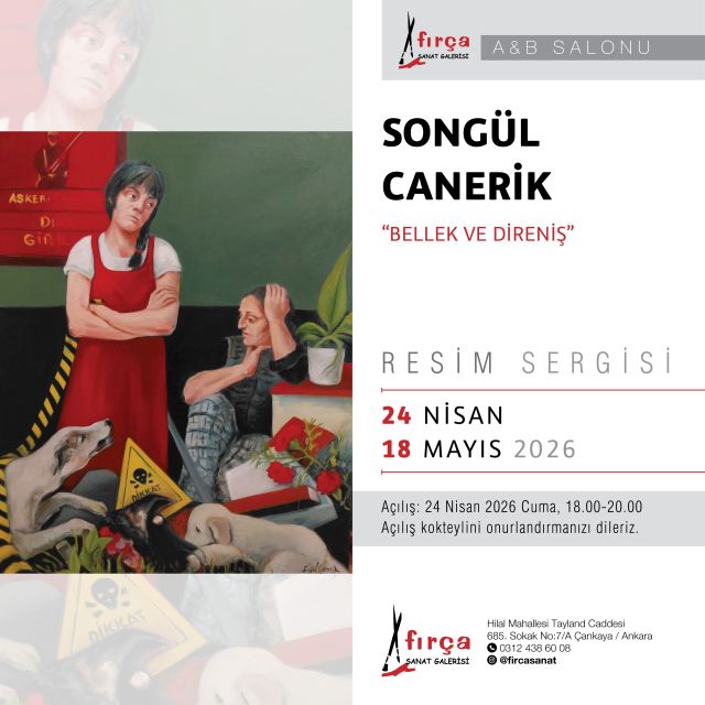 Ankara’da Fırça Sanat Galerisi, sanatçı Songül Canerik’in yeni sergisine ev sahipliği yapıyor. “Bellek ve Direniş” başlıklı sergi, 24 Nisan – 18 Mayıs 2026 tarihleri arasında A&B Salonu’nda sanatseverlerle buluşuyor.