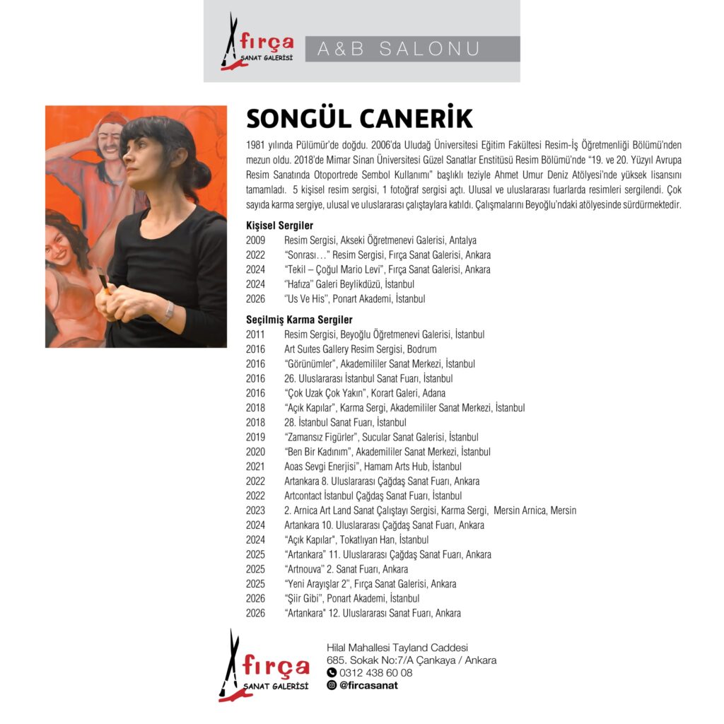 1981’de Pülümür’de doğan Songül Canerik, Uludağ Üniversitesi Eğitim Fakültesi Resim-İş Öğretmenliği bölümünden mezun oldu. 2018’de Mimar Sinan Güzel Sanatlar Üniversitesinde yüksek lisansını tamamlayan sanatçı, bugüne kadar beş kişisel sergi ve bir fotoğraf sergisi açtı; çok sayıda ulusal ve uluslararası karma sergiye katıldı.